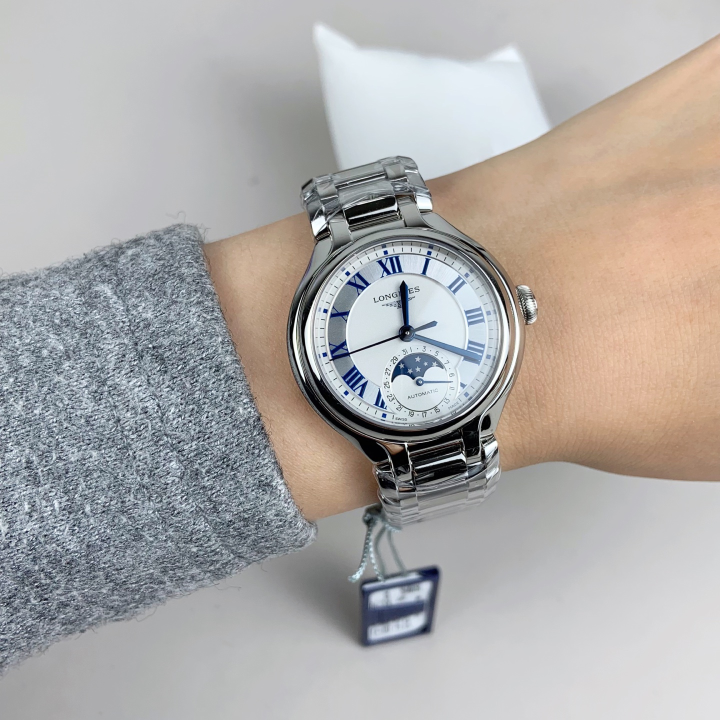 - Elegant Aesthetics: Mother-of-pearl effect white dial with blue Roman numerals, and a moon phase display for a romantic touch.
